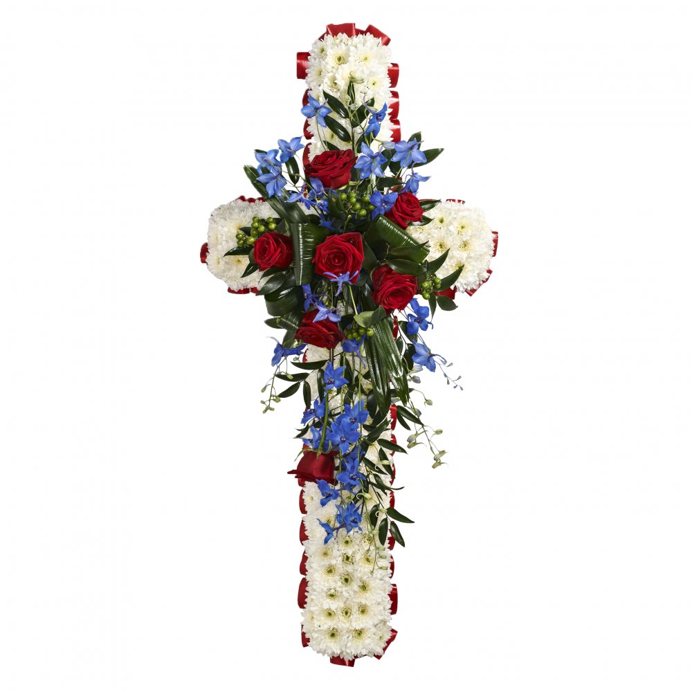This classic 120cm cross is made using massed white flowers, complemented with a red and blue spray. *Fine Print: Every product is handmade and delivered by the local florist. Pictures shown are recent examples of an actual arrangement that was designed by our talented florists. We cannot guarantee what the flower varieties or colours will be, unless specified on the product description.