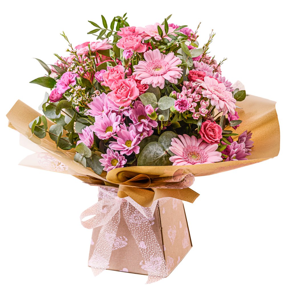 A celebratory hand-tied design featuring the finest flowers in shades of pink, this superb gift is ideal for any occasion when you want to send flowers. Delivered in a gift box for extra convenience.